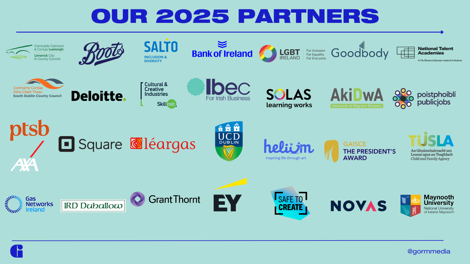 Safe to Create, Helium Arts, Léargas, SALTO Resource Centres, Cultural & Creative Industries Skillnet, Screen Ireland, Coimisiún na Meán, National Talent Academies, Gaisce and THINKHOUSE.